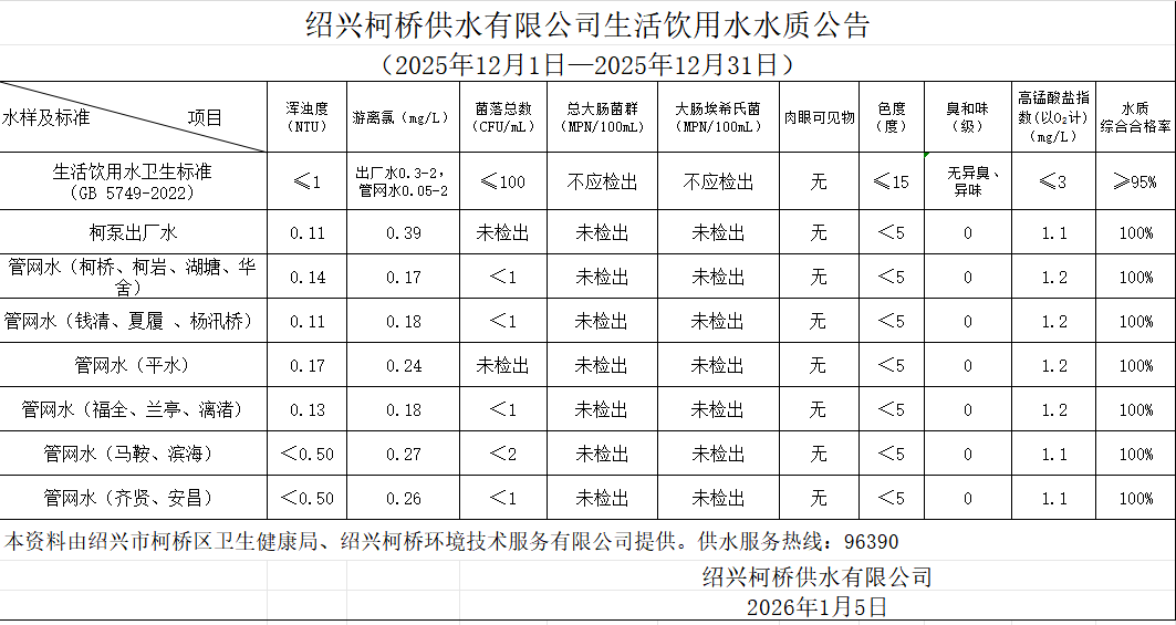 生活飲用水水質公告(2025年12月1日—2025年12月31日)